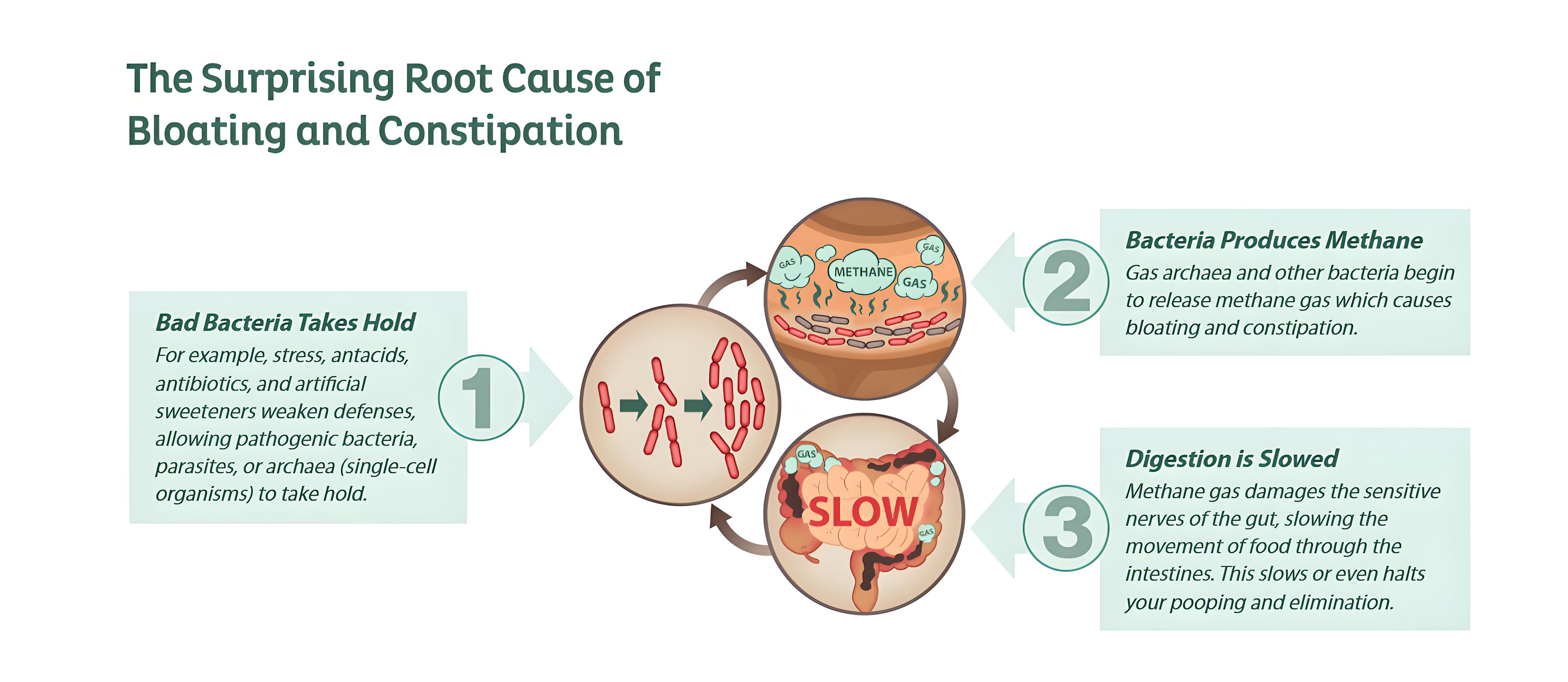 You see, uncomfortable bloating and constipation primarily come from archaea colonizing the small intestine and producing high levels of methane gas.