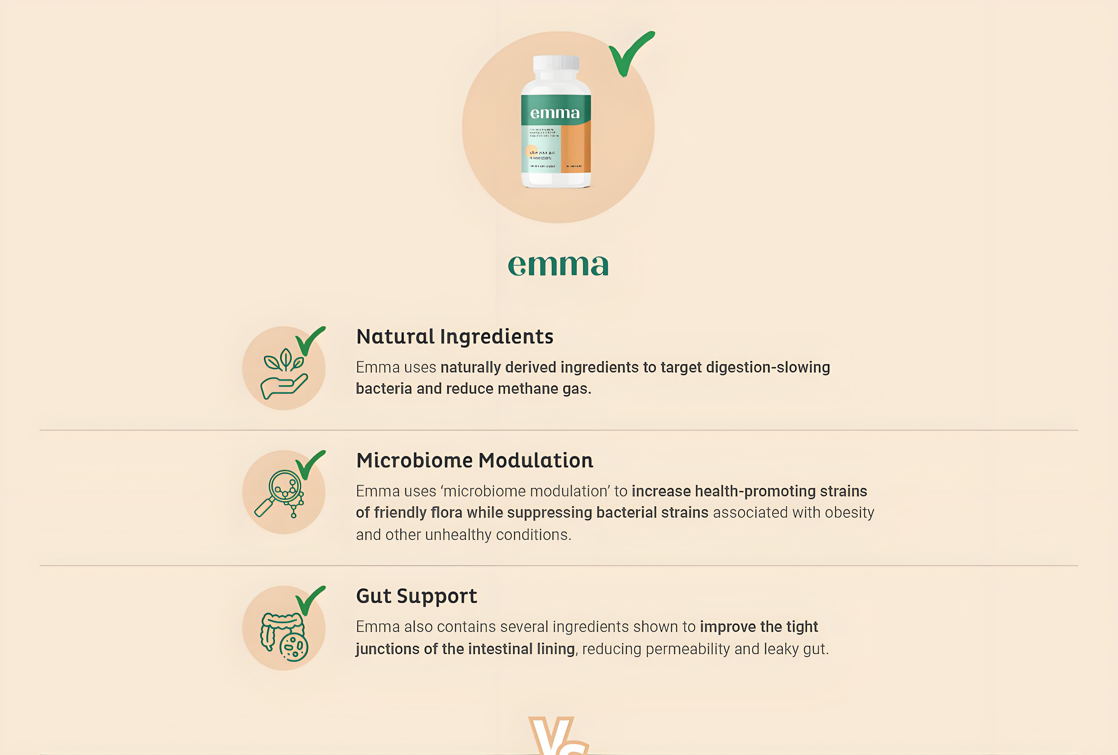 Emma stops the production of methane gas at the source. It works in 3 different ways to normalize bathroom habits, usually within a few weeks of taking it to eliminate constipation and bring back those perfect poops, daily.